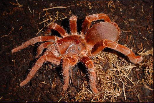 Pelinobius muticus Pocock 1900, the large East African King baboon, is possibly my favourite terrestrial tarantula species. First collected in Kenya in 1899, an adult female leg span can reach upwards of 9", making it the second largest recorded spider after the enormous Hysterocrates hercules. The whole spider is clothed with short hairs giving it an overall velvet appearance and these are especially striking on the curved, thickened rear legs. The hairs are various shades of rust red giving the spider a very outstanding appearance on emergence from its burrow after dark.