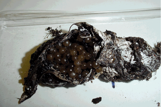 attempt to salvage the eggs for artificial incubation but when the eggsac was opened, the eggs were a light brown colour (as opposed to the usual yellow/cream colour) and had a faint bad smell to