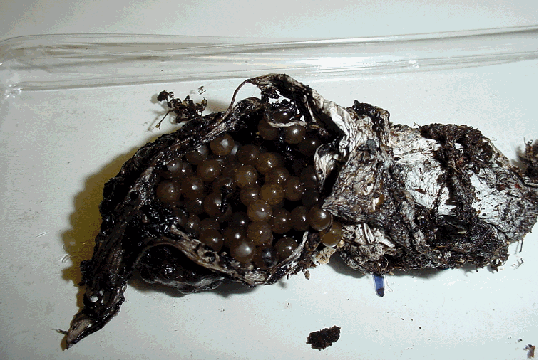 eggs were laid already in a bad condition and it was only 24hrs before they were completely ruined. A previously successful eggsac was produced during 1999 but no meat was introduced into the females