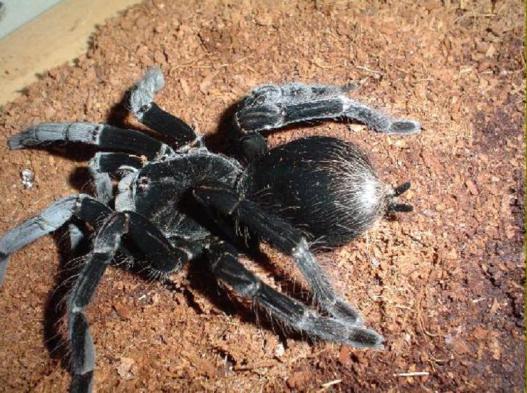 pale hairs. The colours of extremities range from brown to black, but in some cases they can even be bluish. The adult female that I keep is 7.5cm (about 2 inches) big but since it's a young