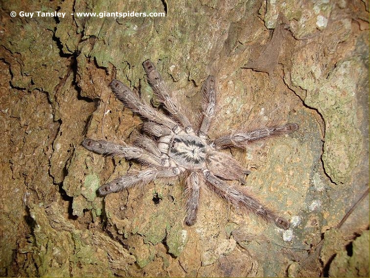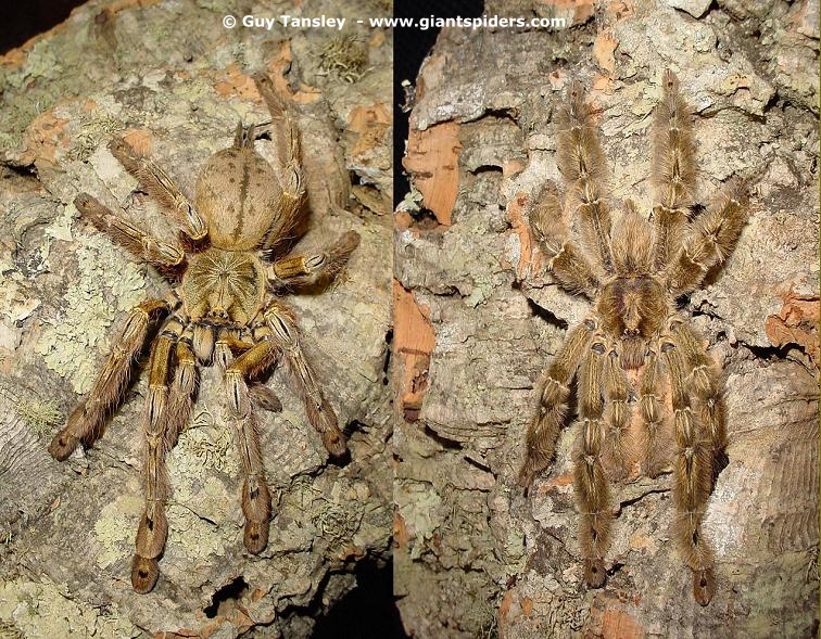 with black similar to Poecilotheria markings. Females can reach a leg span of 15 cm. The males are somewhat smaller and more slender in comparison but have delicate, brush-like hairs on the legs giving the