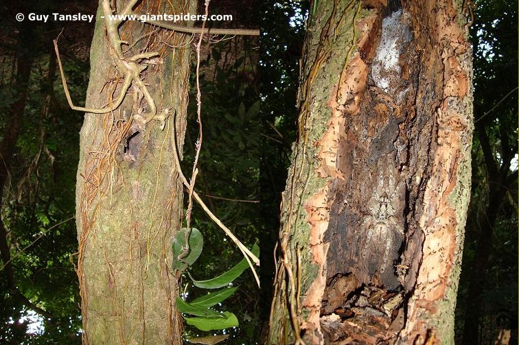 Inspecting a somewhat small hole in a half cut down tree, we were pleased to see the characteristic tarsus spots of an adult female within. Closer inspection with the endoscope revealed not only an impressive spider but she was also sitting on an egg sac! Now I'd read stories of females flying fang-first out of trees when disturbed so it was a relief to watch the female move relatively calmly out of her retreat after Paul carefully opened up the entrance (maybe this was due to her reluctance to flee as she was sitting on an egg sac?).