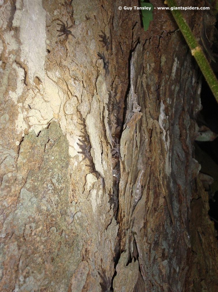 It was at this site that we made our next discovery. Lots of juveniles and sub-adult spiders were seen inhabiting these trees, all surmised to be S. calceatum and we spent the evening recording the relevant data and taking hundreds of photographs but then one specimen in particular caught our attention. We secured it in a clear plastic box and on inspection of the spiders underside, Richard confirmed that we had found a small adult female of our second target species, Heteroscodra maculata and a further search of the surrounding trees also revealed lots of H. maculata spiderlings tucked behind the loose bark!