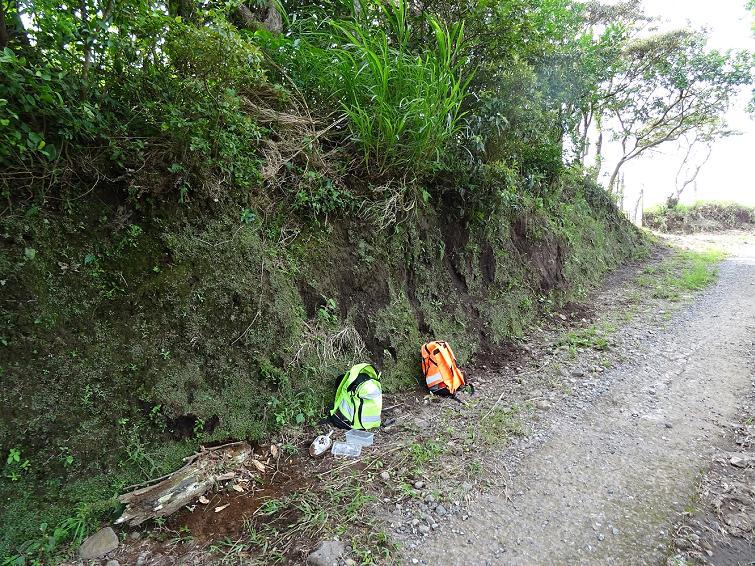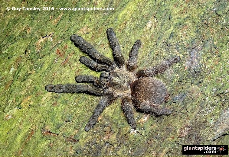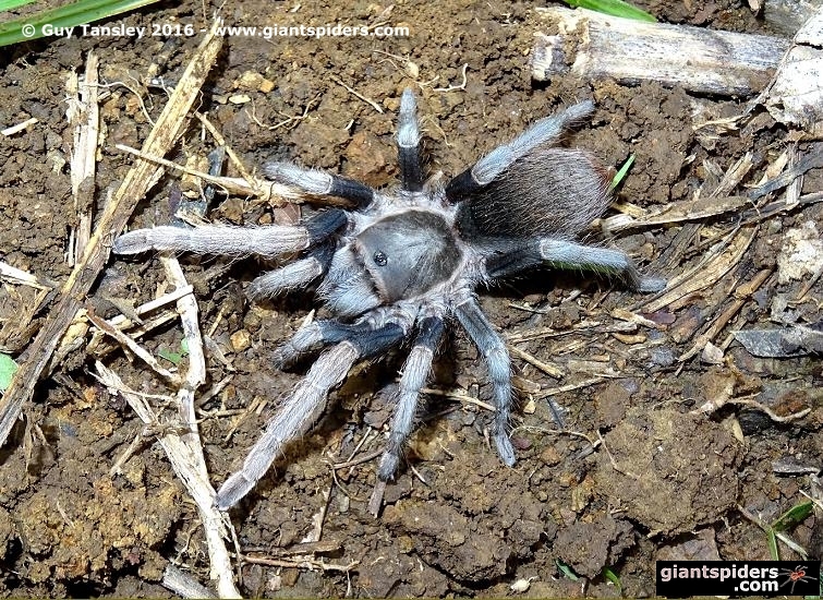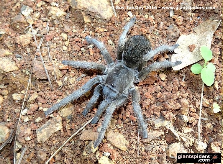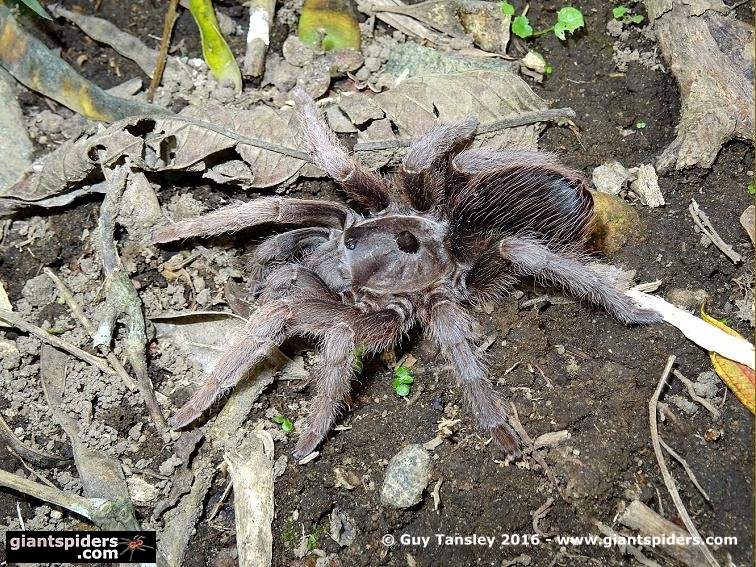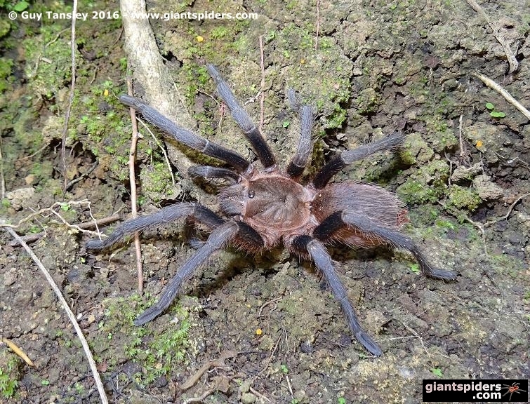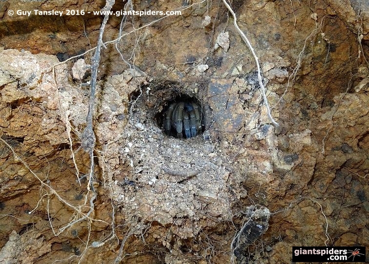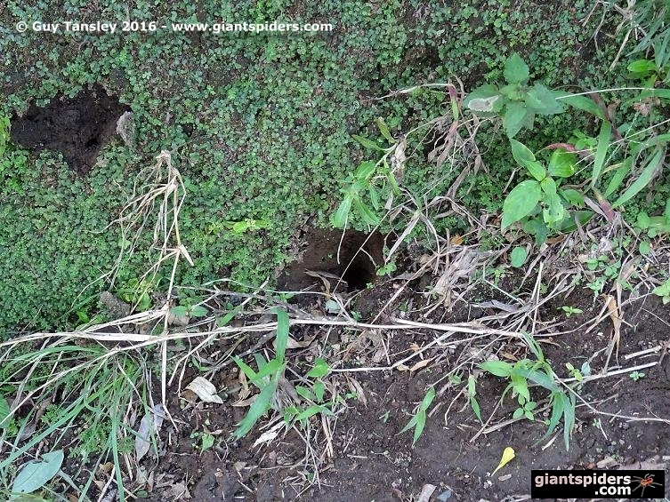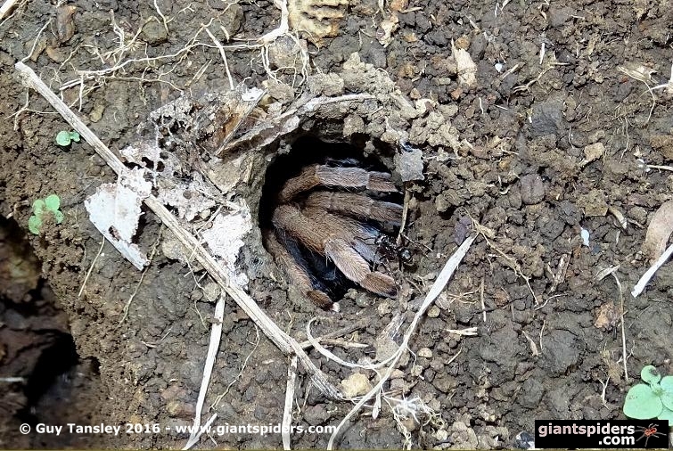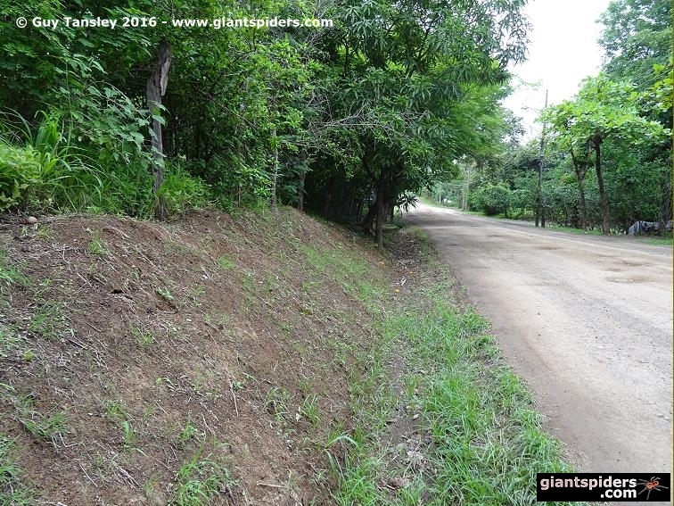 Unidentified species: Although this species appears to be what is considered Brachypelma fossorium, its nomenclature will be revised soon (S. Longhorn, pers. comm.). It was found in the same embankments as A. seemanni. Its slightly different burrows incorporate more grass and leaves than A. seemanni, and the burrow entrance is small compared to the size of the actual spider inside.