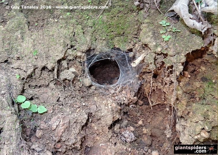 Stichoplastoris sp.: We found an adult female in the hills behind a beach on the Pacific coast. It lived in a very shallow burrow and was easily extracted for photos. The spider had a distinct blue sheen to the chelicerae.
