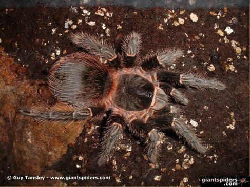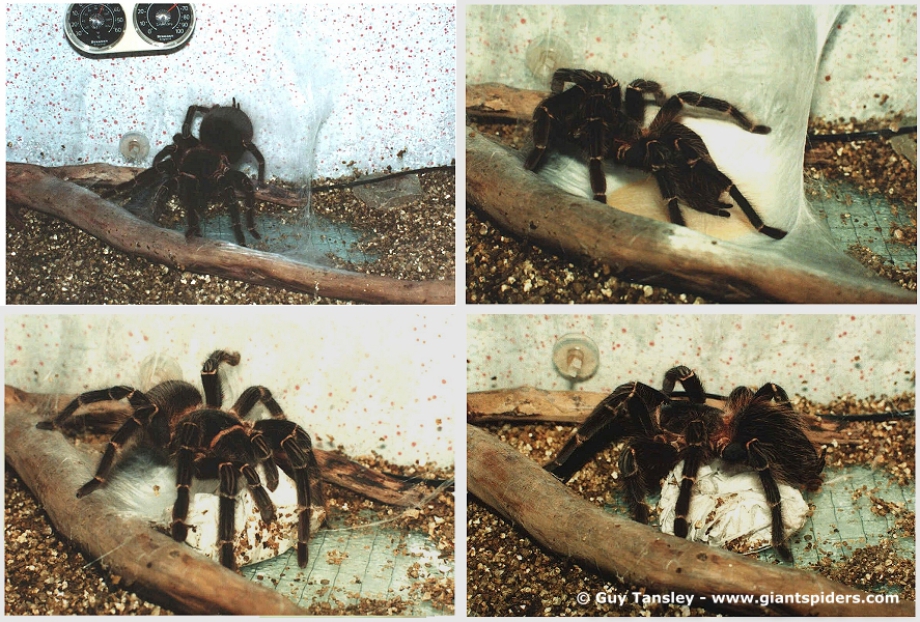 A few days earlier the female was re-housed in a large permanent container for mating and, soon after arriving, the male was placed in her previous container. This produced some interesting behaviour from the male as he immediately began his courtship signalling on touching the females’ web. This smaller tank was placed inside the females and she responded to his vibrations by rapidly drumming with her forelegs. This continued through the night so the next morning he was introduced. Again he began to signal on contact with her web and she replied by slightly drumming with her palps, enticing him closer. He gradually moved onto the tank wall and eventually settled on a piece of vertical cork bark. On removing his box, the female became active and (as expected), began to climb the tank walls. The lid was partially replaced to prevent her escape but she eventually returned to the floor, drumming to the male and heading towards him. He continued vibrating his body until she was very close and sensing this, he changed his courtship behaviour and began reaching towards her with his front legs and slapping the bark with his palps. She took a while to respond but eventually climbed up the bark until she finally touched his front legs and he immediately moved in and began stroking her legs with his. She eagerly opened her chelicerae and he tried to engage her fangs with his tibial hooks. They slowly moved down the bark and he successfully secured her fangs then reaching underneath her, he inserted his right palpal bulb. She characteristically collapsed back on her abdomen and he removed his palp and a slight scuffle followed. They parted and he made a sharp exit up the bark and scrambled out of the tank while she quietly moved back to the floor. The females’ epigynum was very swollen after mating.