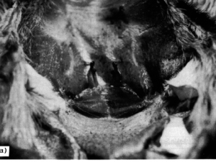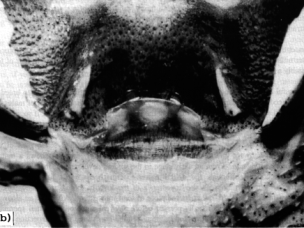 The photographs are basically to show the beginner the well-defined sex organs of the female tarantula: (a) shows a mature female Psalmopoeus cambridgei and (b) shows a mature female Lasiodora parahybana. From an early stage in the spiders development, the signs of a female are quite obvious and although the actual paired spermatheca aren't fully formed, successful determination is possible with the appearance of the heavily folded area known as the uterus externus (the large upward, rather curved piece of semi-transparent 'skin') and an alcove forming a large lower lip. This lip is usually present before any real signs of the actual spermathecae are developed and again, there is a marked difference in the immature male. Inspection of a suspected male cast skin is again obvious if the specimen is fairly large as none of the above features are present. Note: these photographs both represent examples of paired spermatheca, but some species have fused spermatheca forming a large fold behind the uterus extemus in species such as Brachypelma hamorii.