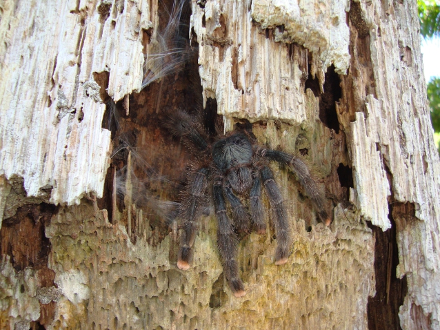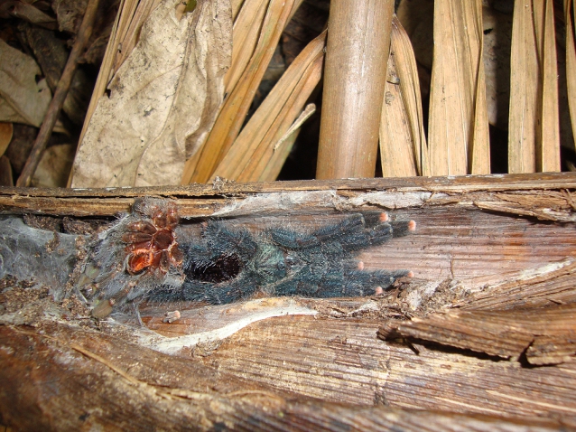 Shining my torch into a rotting tree stump, I was pleased to see the familiar hairy legs of a very large adult Avicularia female sitting at the bottom. There was no silk whatsoever so it didn't take much effort to tickle the spider up the hollow and out into the open.