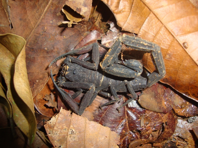Day 5: We headed for the Saramacca district about 1.5 hours from Oxygen. We clambered into the forest and quickly realized that it was pretty dense and that splitting up was a bad idea for fear of getting lost. We worked the area around the trail path for around 30 minutes and concluded that it was probably too wet underfoot for Theraphosa and too dense to work with any success. We exited the tangle of trees and surveyed the site for a better area and soon found a large stretch of clearer forest opposite the road outside of the farm where there was a small man made fire burning just a few feet into the forest. Inside this stretch it was much easier to work so we set about searching both the trees and ground for spiders. Although seemingly prime habitat, there was a distinct lack of insects and as it turned out, spiders. Likely holes in the undergrowth were investigated with the endoscopes but without joy. I photographed a gorgeous kite spider and Michael found and a large Tityus scorpion.