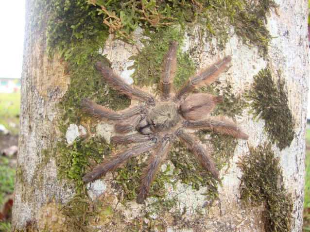 After an hour or so the call came in that Paul had found a silken retreat and by the time I reached him and the others, they had tickled it out and it was a Tapinauchenius plumipes, small in size and an overall brown coloration. Several photos later we continued our search for another hour before heading into the zoo to search the interior trees for Avicularia sp. The zoo was poor to say the least, tigers in the smallest cage I've seen, several eagles and snakes and even 2 adult Avicularia in a glass display tank. A quick search of the zoo grounds revealed another Tapinauchenius silken tube and I eventually found a cluster of trees containing 3 juvenile Avicularia that were easily photographed.