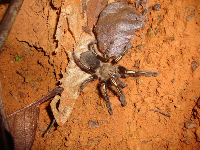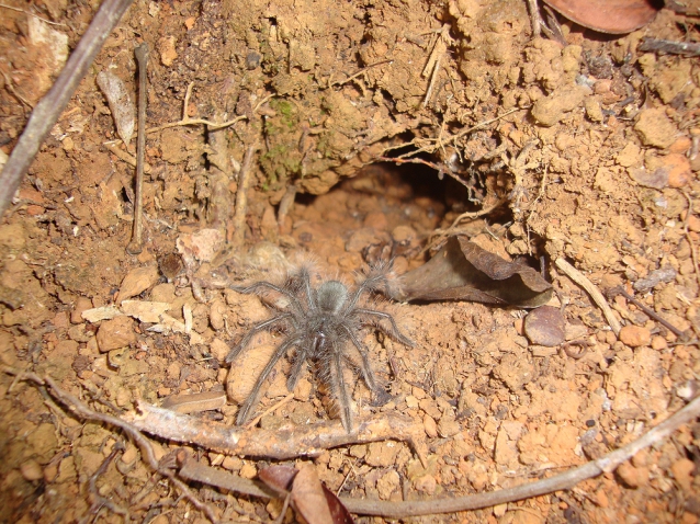 After a cold drink, we headed down one of the many forest paths and we soon spotted a dart frog (Ameerega trivittata). Down the path we split up and searched for likely Theraphosa holes but after using the endoscope on many, we failed to find any. On one rise I spotted a large E. murinus burrow and she was at the entrance. Tickling once again failed but we got some good shots with the endoscope camera. Andy attempted to dig the spider out but was soon stopped by the amount of roots and rocks into which the burrow descended.