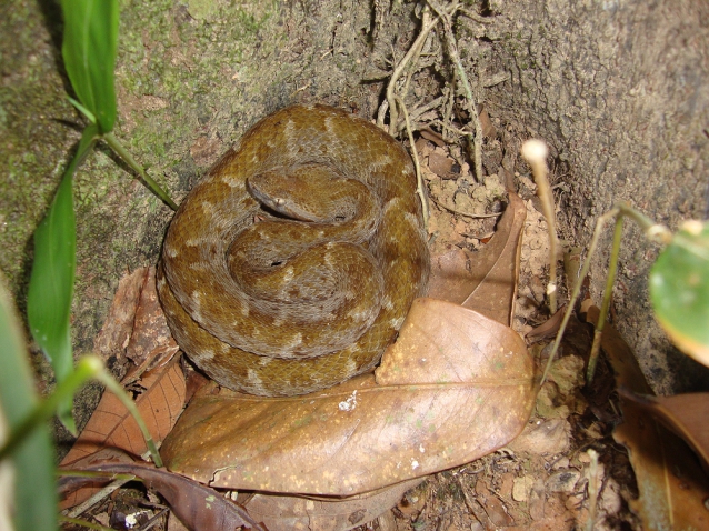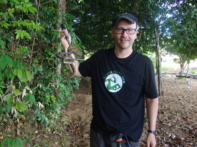 After a late lunch, all of us kitted up to do a late afternoon recon of a new forest trail. We first checked the river shore trees for more Tapinauchenius and found none but Michael spotted a medium sized snake between the roots of a tree that I had just walked by. A few photos later, Michael finally got to use his snake hook as he wrangled it for more photos. This snake was a so-called Labaria or fer de lance (Bothrops sp.) and by all accounts, quite venomous!