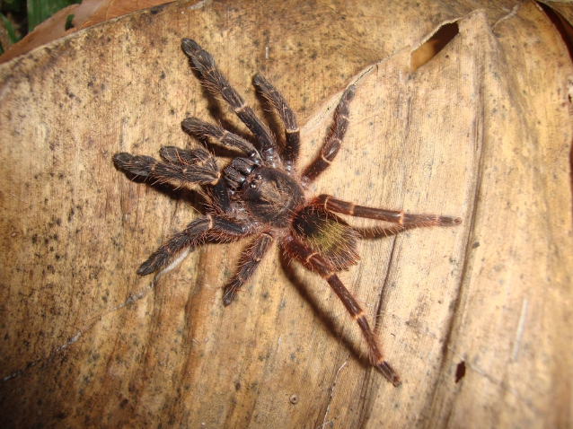After dinner, I did a short night walk to a couple of areas I'd yet to check out. There were lots of frogs and toads and an extremely noisy but hidden tree frog in the roof of one of the cabins near the river. Near the waters edge I spotted some silk on a tree and on inspection was greeted by a medium sized spider which lacked the pink toes. I had found another Tapinauchenius! Unable to tickle this one out, I left it alone for a closer look the next day. Further walking revealed orange and arrow-head bats in trees, a large katydid and a medium sized brown millipede and two large silken tubes in the farthest cabin, one of which was occupied but sadly out of reach. You would need a ladder for this one or one very large tickling stick!