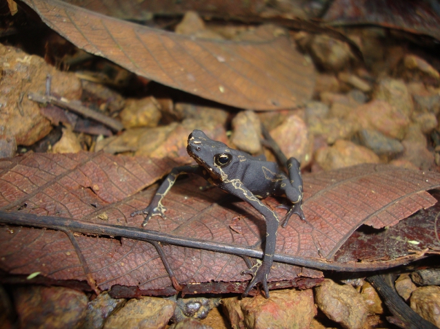 Walking up, we checked out the intended burrows but didn't work them, instead deciding to do that on the way down. The puddles were full of unusual frogs and toads, calling and mating. Paul checked out the surrounding area, Andy a forest trail and Michael and I decided to head down to one of the waterfall trails. Our main aim for this walk was frogs and we weren't disappointed! On the trail, Michael spotted a small ornate harlequin frog (Atlopus hoogmoedi) after I nearly trod on it!
