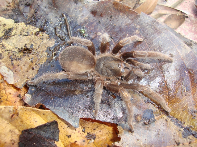 Day 8: Leaving Oxygen, we made our way to Babunhol. Once there we were greeted by the manageress who presented us with an Avicularia in a box as a welcoming gift! She had heard we were coming! We unpacked and settled into our accommodation of open air kitchen, 3 bedrooms and separate toilet and shower block, all with views over the river. We slung up our mosquito nets on the bunk beds (a bit of an effort in the high humidity) and after lunch we headed back out to the local gas station for supplies and on the track, Paul spotted a silk lined burrow and it was confirmed as a juvenile Ephebopus murinus. We resisted working on it and headed to buy supplies. Michael spotted another larger burrow on the way back so these were marked to be revisited later that evening.