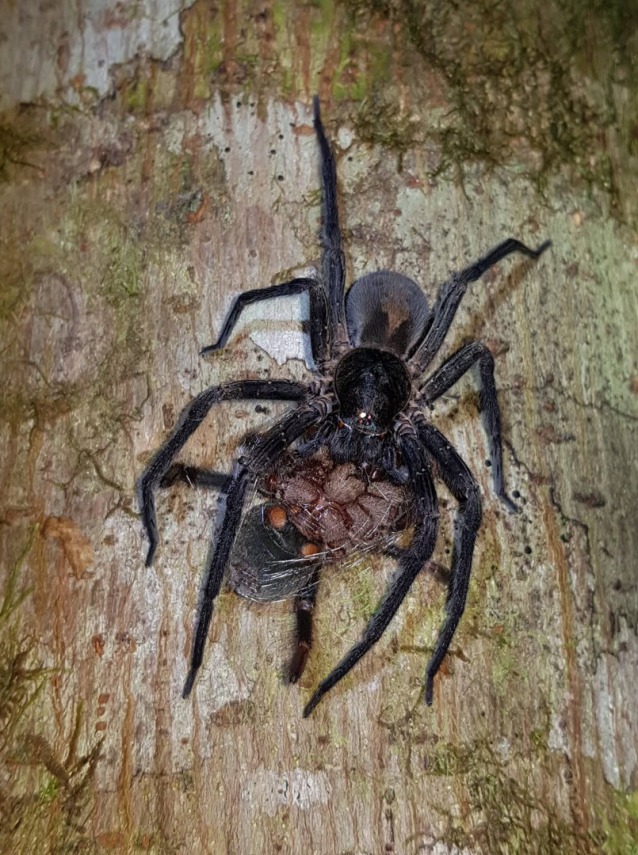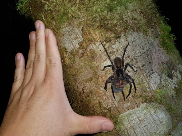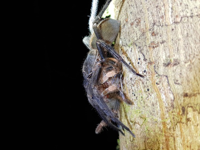 The photos show a large unidentified Wandering spider (Ctenidae) predating on a large juvenile / sub adult Megaphobema mesomelas. Rony came across this sight when on a night walk and was eager to share. It’s doubtful that the wandering spider took the tarantula from its burrow – more likely that the M. mesomelas was out in the open and strayed into the path of the Wandering spider adding more evidence to the idea that tarantulas are more nomadic than we first thought.