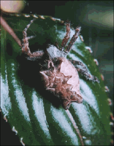 and white zigzag pattern with six thorn-like protrusions. The carapace is covered with grey/brown tufted hairs and legs are cream banded with brown, again similar
