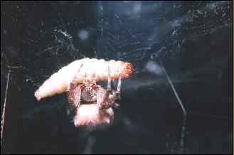 mesh of loose threads. The female guards the egg case adamantly and if the container is opened at any time, she will run to protect it, wrapping her legs tightly around it.